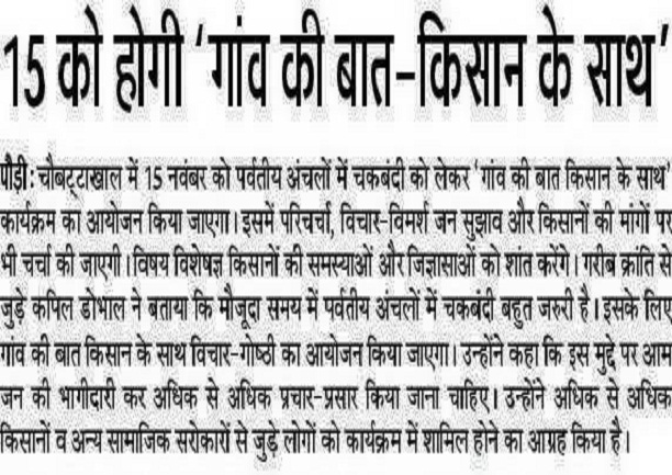 गरीब क्रान्ति अभियान विगत चार साल से भूमि के एकत्रीकरण की मांग को लेकर जनजागरण में लगा है और अब तक अनेक आयेाजन कर चुका है। यह एक नितान्त गैर राजनीतिक फोरम है जिससे अनेकों प्रबुद्धजन व युवा सम्बद्ध हैं। इसका एक मकसद चकबन्दी के प्रति समाज में जागृति लाने के अलावा विषय पर चर्चा परिचर्चा के दौर को आगे बढ़ाना ताकि जनआकाक्षांओं के अनुरुप चकबन्दी हो सके और बंजरखेत सरसब्ज हो सकें।
